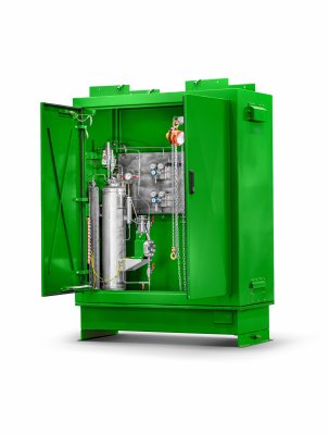 « Du fait de l’absence de courant électrique sur le pont du navire, nous avons dû élaborer un système sans composants électriques, » explique M. Richter. « C’est ce qui a déterminé le choix de la pompe et du type de dosage ». La pompe à air comprimé PKH, une unité purement pneumatique qui est conçue pour le débit de gaz de 500 m3 /par heure à 30 bars requis sur le site, a été installée. L’agent odorant, l’éthylmercaptan, ajouté au GPL au fur et à mesure est dosé par une vanne de régulation mécanique préréglée avec un débit de dosage fixe, de sorte qu’aucune commande électronique n’est nécessaire. Le réservoir d’odorant offre une capacité de 200 litres. Un dispositif de levage supplémentaire permet de le sortir de l’armoire pour le remplir.