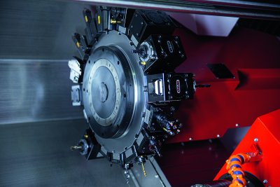 Sur le MT65M-G2 avec contre-pointe, la contre-pointe est montée sur le rail de guidage à rouleaux et peut être déplacée automatiquement sur une longueur de 500 mm. Une lunette traînante de Ø 8-101 mm est disponible en option. Cela permet une utilisation encore plus flexible de la machine, par exemple pour l’usinage de pièces arbrées. Sur le MT65S-G2 avec contre-broche, la tête de la contre-broche est placée sur son propre rail de guidage à rouleaux et peut être déplacée automatiquement sur une longueur de 580 mm. La broche est entraînée par un moteur de broche intégré (ISM) avec refroidissement liquide. Un éjecteur de pièces, dont la course est pilotée, raccordé au système de liquide de refroidissement, permet de récupérer les pièces finies en toute sécurité. En outre, une tourelle VDI30 à 12 stations (en option VDI 40) avec une technologie à moteur unique est disponible. Un servomoteur alimente les outils tournants ou assure la mise en rotation – il n’y a donc pas de soulèvement lors de l’indexage qui se fait par commande numérique. Chaque station peut recevoir des porte-outils tournants ; en alternative, une tourelle BMT55 à 12 stations avec entraînement direct, jusqu’à 12000 tours/minute, ou même une tourelle BMT45 à 16 stations peuvent être intégrées.