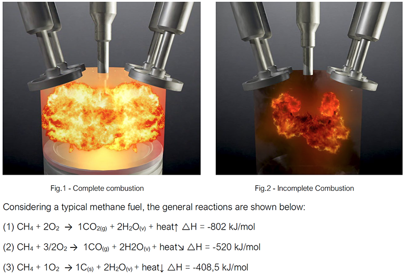 Dans un moteur à combustion interne (ICE), ces réactions typiques se produisent simultanément mais à des degrés divers en fonction de l’efficacité de l’ensemble du système. Dans un nouvel ICE, où tous les composants sont encore propres et neufs, la réaction chimique (1) est prédominante et une utilisation efficace du carburant se produit. Lorsque les composants du moteur commencent à s’encrasser (former des dépôts) ou à s’user, les réactions chimiques (2) et (3) augmentent leur contribution, nécessitant ainsi plus de carburant pour effectuer la même quantité de travail. Plus le carburant est consommé, plus les gaz de combustion sont également émis, y compris le CO2 qui est maintenant devenu une préoccupation majeure en raison de son effet de serre très important entraînant une augmentation du réchauffement climatique. D’autres émissions contribuent également à « l’effet de serre », mais loin d’être au même degré que le CO2.