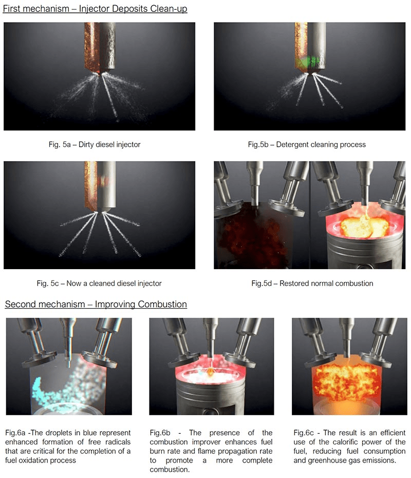 Le résultat est l’apparition d’un processus de combustion plus efficace qui maximise la réaction chimique (1) tout en minimisant les réactions chimiques (2) et (3), libérant ainsi plus d’énergie, des rendements améliorés et une consommation de carburant réduite. En conséquence directe, en réduisant la quantité de carburant nécessaire pour effectuer une tâche donnée, on obtient une réduction des émissions de CO2, de CO et d’hydrocarbures non brûlés (comme la suie).