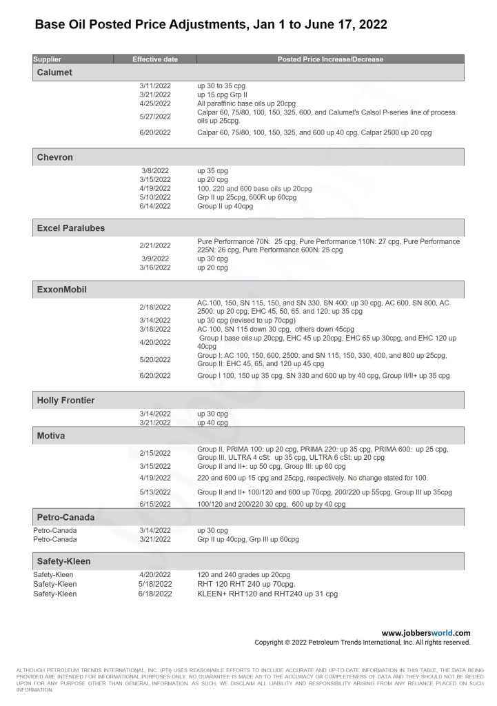 Le nombre et l’ampleur des augmentations de prix des additifs pour lubrifiants déjà observées en 2022 ont également été notables. Là où il y a typiquement 1 à 2 augmentations additives observées en un an, trois ont déjà 3 annoncées par Afton et Infineum cette année.