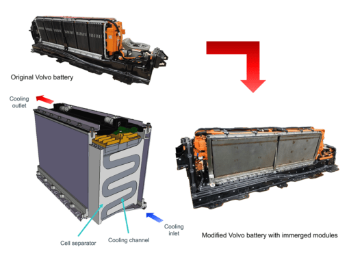 Afin de soutenir le développement de cette technologie, TotalEnergies a décidé de l’appliquer pour la première fois dans une voiture de route, en remplaçant le système de refroidissement de la batterie d’un Volvo XC90 hybride rechargeable par une alternative à immersion. En termes de performances, le résultat est immédiat : charge plus rapide, meilleur refroidissement, sécurité renforcée, coût et masse moindres, sans aucunement avoir à modifier la conception de la batterie ou du véhicule.