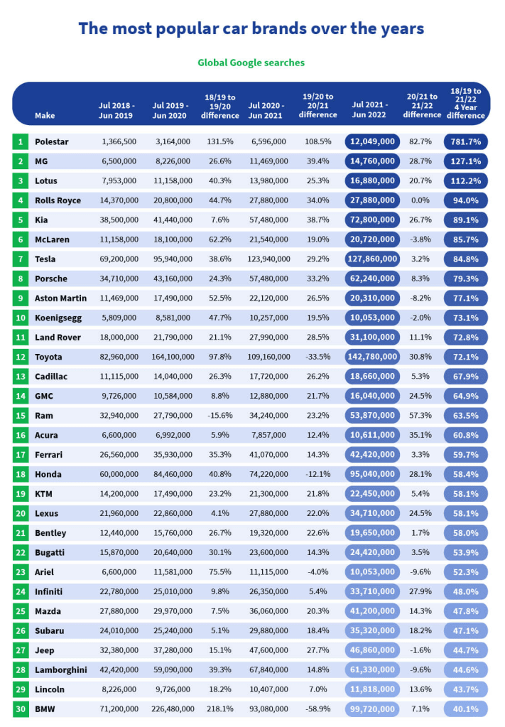Le constructeur suédois Polestar est la marque automobile la plus tendance , ayant enregistré la plus forte augmentation des recherches Google dans le monde au cours des quatre dernières années. Il y a eu près de 11 millions de recherches de plus au cours de l’année dernière qu’en 2018/2019 , ce qui équivaut à une augmentation des recherches de plus de 780 % , ce qui est supérieur de plus de 700 % à l’augmentation moyenne des recherches sur toutes les marques de voitures (60,8 % ) !