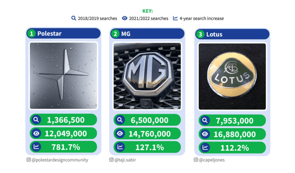 Nom historique de l’automobile britannique, MG s’est classée comme la deuxième marque automobile à gagner en popularité . Désormais une marque chinoise, MG se concentre beaucoup plus sur les voitures familiales, l’intérêt pour ses voitures ayant considérablement augmenté ces dernières années. Les recherches sur Google ont augmenté de près de 130 % en quatre ans, soit une augmentation brute d’environ 8 millions de recherches dans le monde.