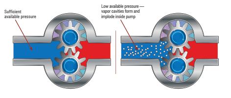 Le mouvement des engrenages rotatifs entraîne une chute de pression à la ligne d’aspiration. La différence de pression résultante entre le réservoir et l’entrée de la pompe provoque le passage du fluide de la pression supérieure à la pression inférieure. Tant que la différence de pression est suffisante et que le chemin d’écoulement est clair, l’opération fonctionne bien, mais tout ce qui réduit le flux d’entrée peut créer des problèmes. Chaque fois que la pompe ne peut pas avoir autant de fluide qu’elle essaye de livrer, la cavitation se produit, comme indiqué dans la bonne illustration ci-dessous.