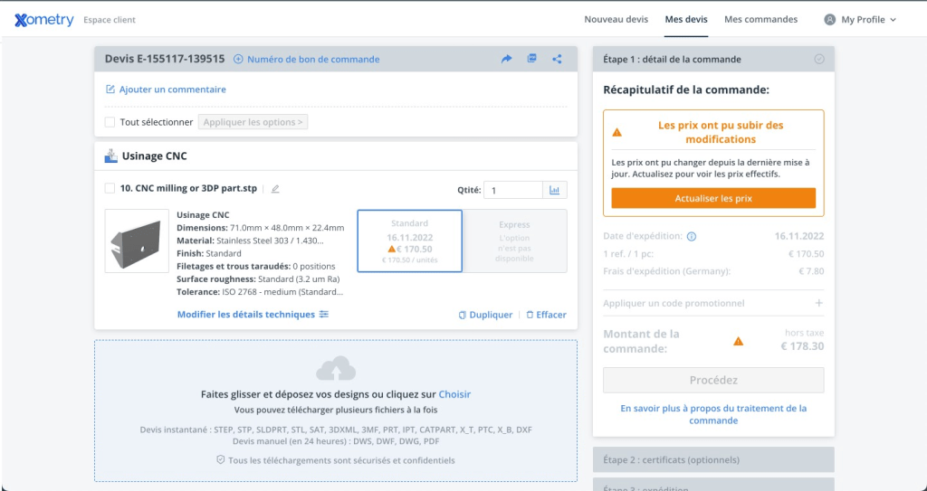 Grâce à sa plateforme de devis instantané, Xometry vous permet d’obtenir un devis en usinage CNC en seulement quelques secondes, accompagné d’une analyse de fabricabilité et la possibilité de faire varier les quantités et matières en temps réel. Rien de plus simple, il suffit de télécharger vos modèles CAO directement sur la plateforme sécurisée, et de sélectionner les options de fabrications souhaitées.