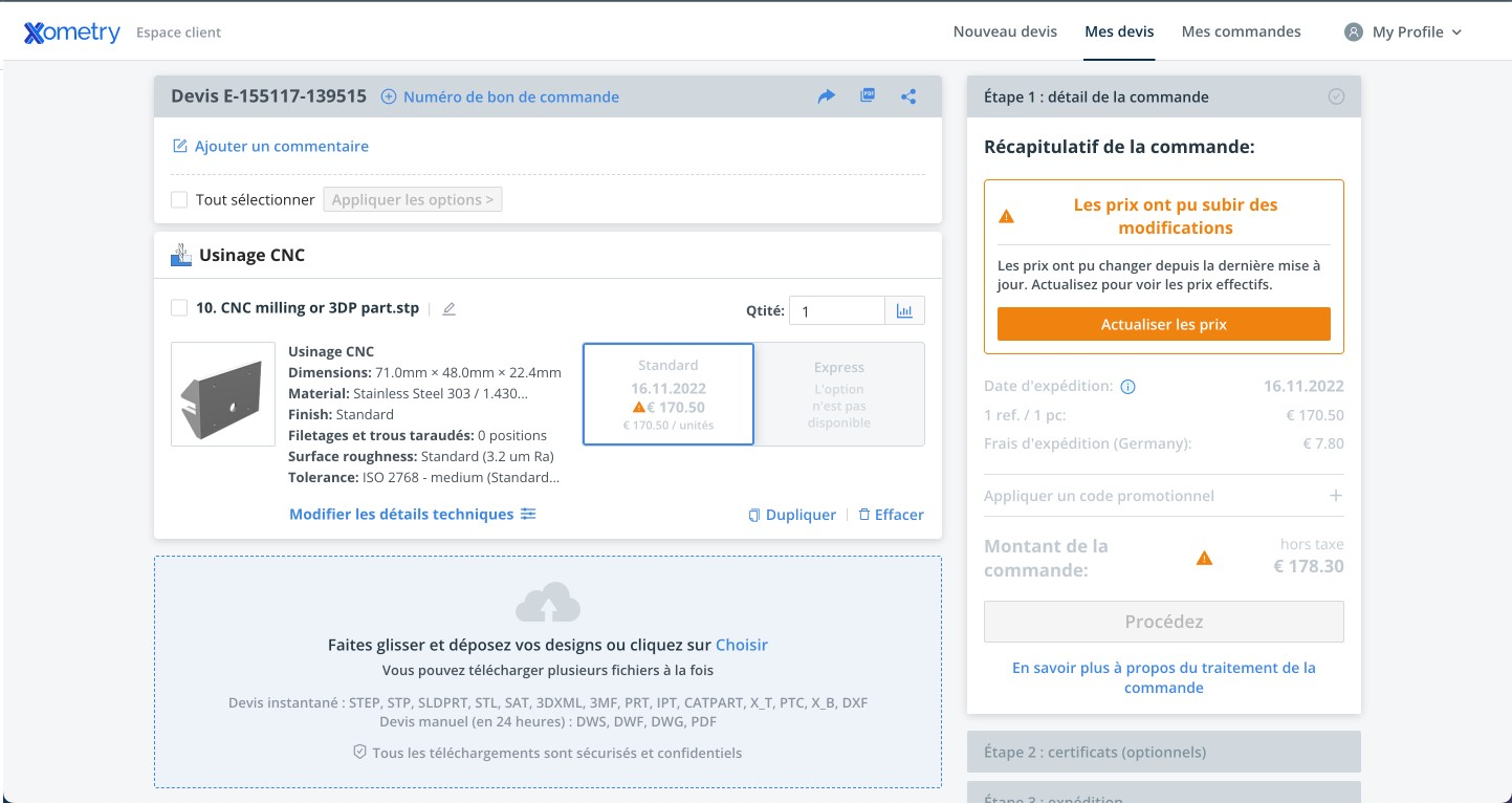 Grâce à sa plateforme de devis instantané, Xometry vous permet d’obtenir un devis en usinage CNC en seulement quelques secondes, accompagné d’une analyse de fabricabilité et la possibilité de faire varier les quantités et matières en temps réel. Rien de plus simple, il suffit de télécharger vos modèles CAO directement sur la plateforme sécurisée, et de sélectionner les options de fabrications souhaitées.