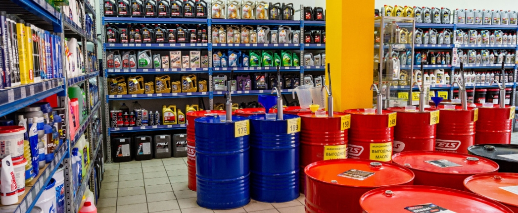 Huiles moteur et autres fluides automobiles sur des étagères et dans des fûts dans un magasin de pièces automobiles à Omsk, en Russie. © mk1one