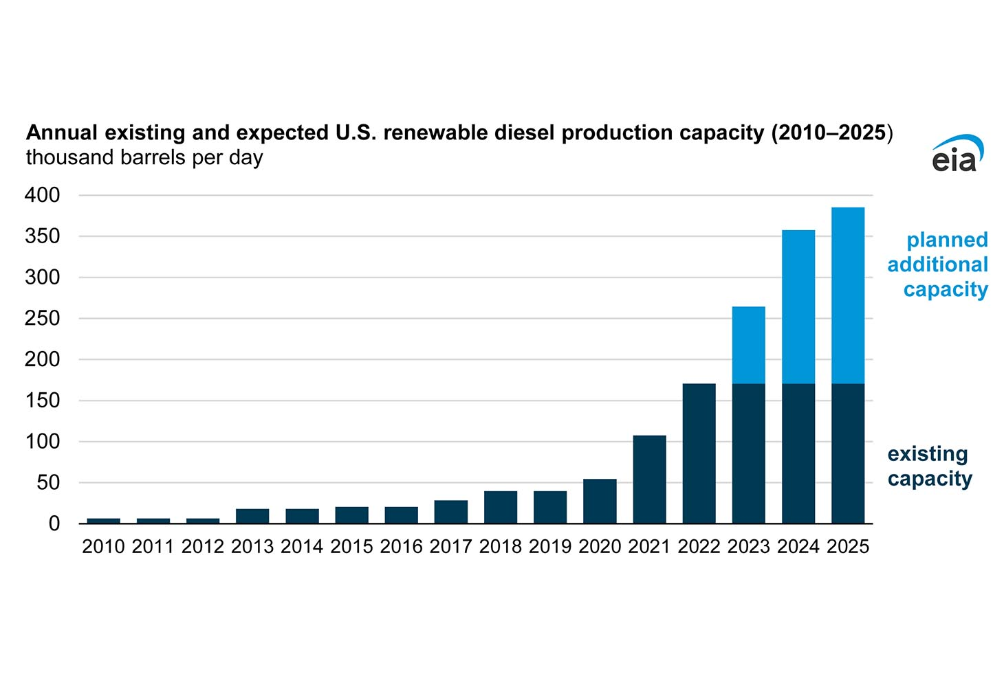 La capacité de production américaine de diesel renouvelable pourrait plus que doubler par rapport aux niveaux actuels d’ici la fin de 2025, sur la base de plusieurs annonces de projets qui sont en construction ou pourraient bientôt commencer leur développement, selon l’Energy Information Administration (EIA) du Département américain de l’énergie.