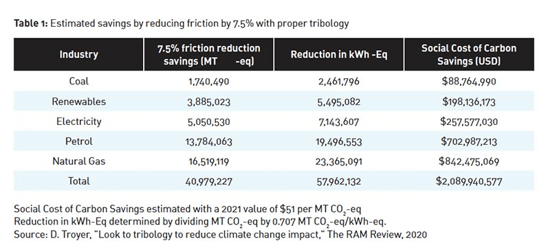 Les États-Unis ont émis environ cinq milliards de tonnes de CO 2 par an ces dernières années, dont environ 1,6 milliard de tonnes de CO 2 par an provenaient de la production d’électricité. Selon l’Agence des projets de recherche avancée-Énergie (ARPA-E), jusqu’à 24 % de l’énergie primaire peut être économisée si toutes les mesures tribologiques possibles sont mises en œuvre. En supposant des réductions conservatrices de 7,5 % par frottement sur la production d’électricité en appliquant une tribologie appropriée, près de 120 millions de tonnes métriques (MT) d’équivalent CO 2 peuvent être évitées d’être émises dans l’environnement. Le groupe de travail interagences a estimé les coûts sociaux du carbone résultant de la réduction de la friction sur la production d’électricité en 2020 à 6,1 milliards USD, sur la base de 51 USD par MT d’éq. CO 2 .