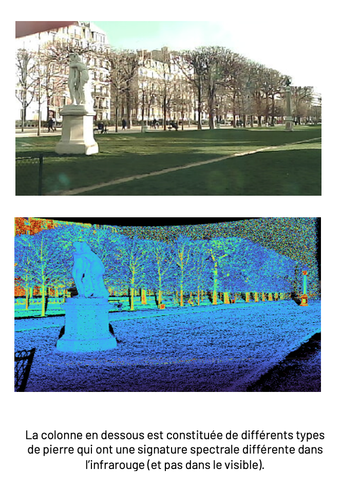 Cela permet d’obtenir des données-clés sur la nature chimique des matériaux. Le capteur 3D d’IRIDESENSE permet d’obtenir la signature spectrale des éléments en mesurant leur réflectivité propre dans le proche infrarouge (SWIR), ce qui associé à l’intelligence artificielle, rend possible leur analyse et leur identification. Par exemple, la solution d’IRIDESENSE peut différencier deux matériaux ayant la même couleur dans le visible mais de nature chimique différente.