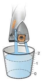 Il est essentiel d’avoir un système de filtrage du liquide de coupe correct et une pression adéquate pour réussir le perçage avec CoroDrill 862. Une pression insuffisante ou un débit d’arrosage inadapté peuvent provoquer une élévation de la température dans la zone de coupe, une accélération de l’usure, des problèmes d’évacuation des copeaux et une défaillance prématurée de l’outil.