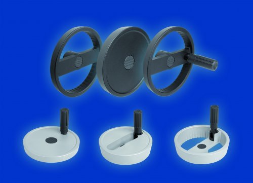 - 6 versions : Disponibles sous forme de volants à rayons ou pleins, sans manivelle, ou avec poignée cylindrique rotative ou rabattable