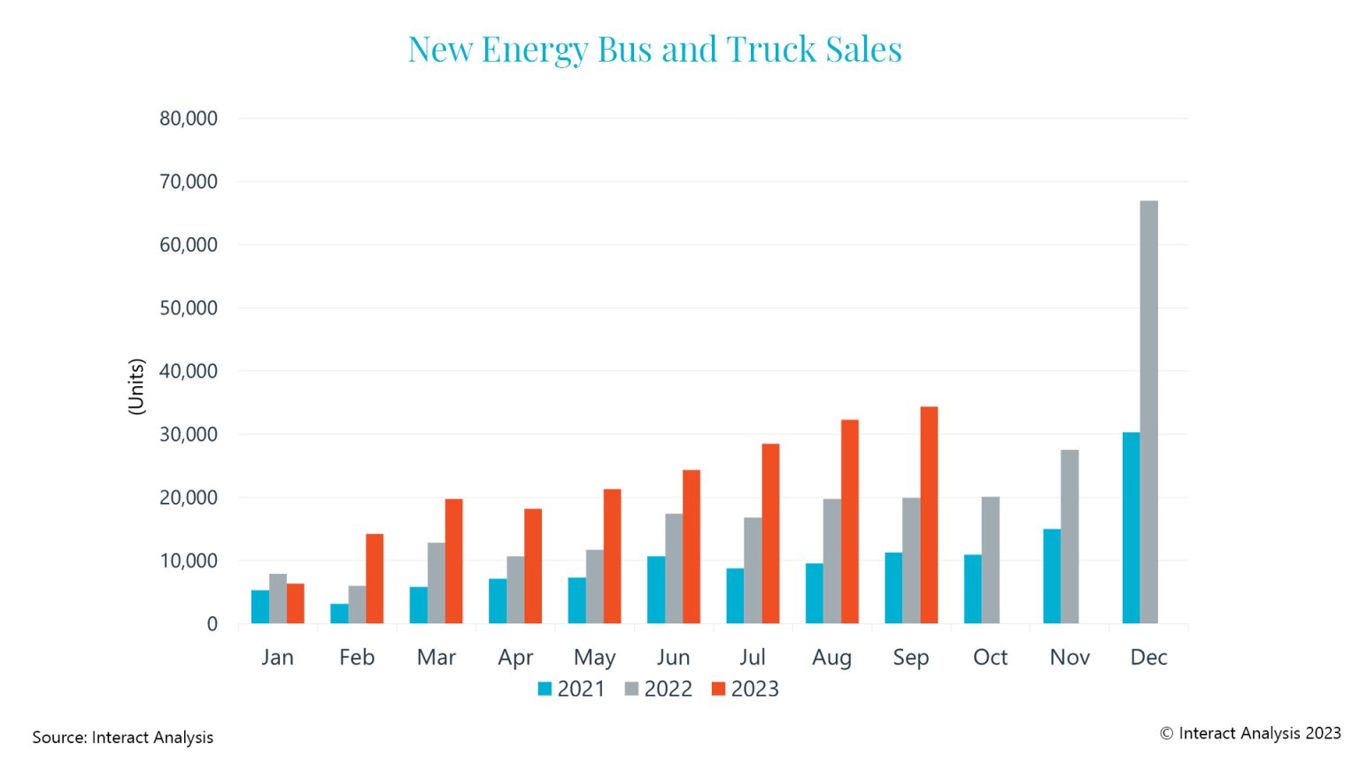 Au cours des trois premiers trimestres de 2023, les immatriculations de véhicules utilitaires à énergies nouvelles (NECV) en Chine ont atteint 199 000 unités, soit une hausse de 62,0 % sur un an. Sur les neuf mois jusqu’en septembre 2023, les ventes de NECV ont déjà atteint 83,9 % du total de l’année dernière (238 000 unités en 2022). Au cours des trois premiers trimestres de cette année, le taux de pénétration du marché des véhicules utilitaires à énergies nouvelles a augmenté de 3,2 points de pourcentage sur un an, pour atteindre 9,2%, avec des taux pour les camions et les bus à énergies nouvelles s’élevant respectivement à 4,8% et 38,4%. .
