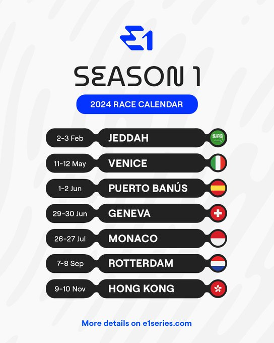 Alejandro Agag, président et co-fondateur de l’E1, a déclaré : « La liste des noms dans le calendrier de la saison 1 montre l’immense confiance que les acteurs de notre ville accordent à l’E1 avant même le début de la première course et il y a encore tellement plus à venir. championnat. »