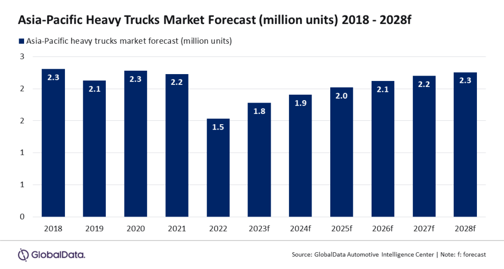 Le dernier rapport de GlobalData, « Global Sector Overview & Forecast: Heavy trucks » révèle que le marché des camions lourds dans la région APAC devrait atteindre 1,8 million d’unités en 2023 et 2,3 millions d’unités en 2028. La région détient une part importante de 56,4 % du marché mondial. pour les poids lourds en 2023, et cette part devrait atteindre 60,9 % d’ici 2028.
