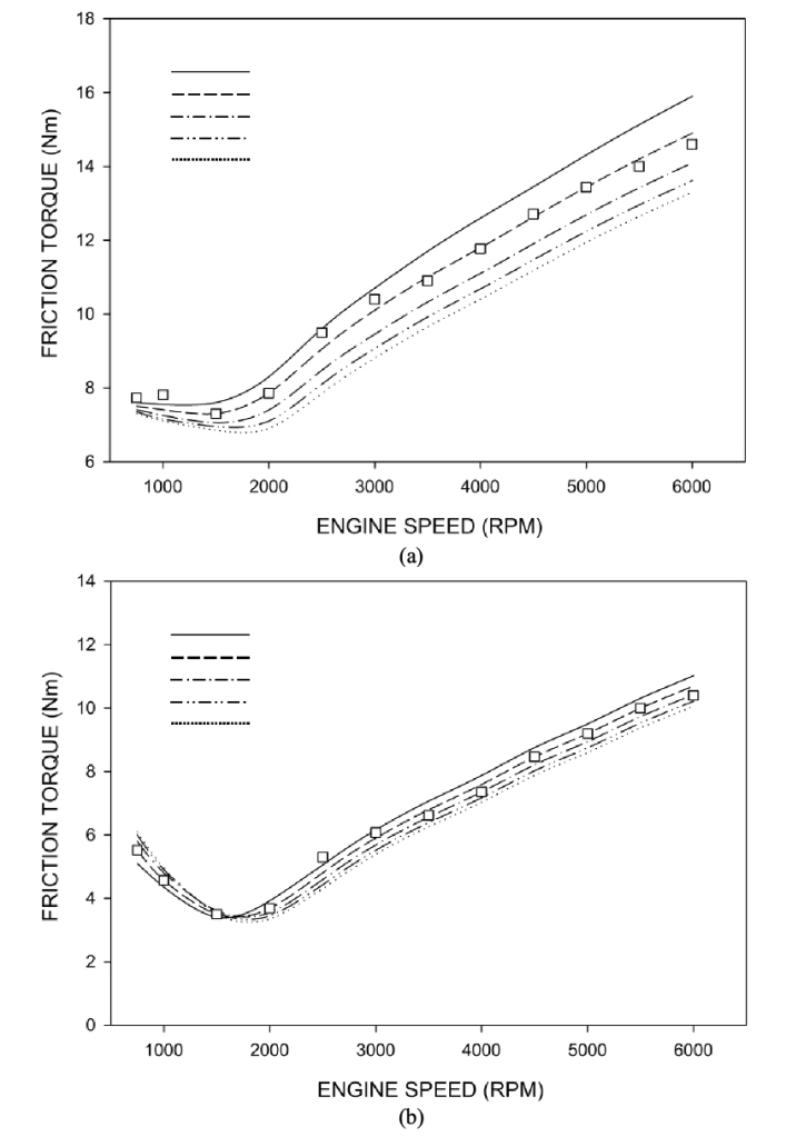 Les données de couple de friction pour le moteur i4 EcoBoost de 1,6 L sont présentées à la figure 2 (a, b). La contribution de la pression efficace moyenne de friction (FMEP) a été évaluée comme la différence entre la pression efficace moyenne de freinage (BMEP) évaluée à partir du couple de démarrage et la pression efficace moyenne indiquée (IMEP) évaluée à partir des lectures de pression dans le cylindre. Les carrés représentent les points expérimentaux obtenus pour l’huile moteur SAE 5W-30 à des températures d’huile de 30 o C et 90 o C. Les lignes montrent l’effet anticipé de la viscosité de l’huile sur la friction du moteur.