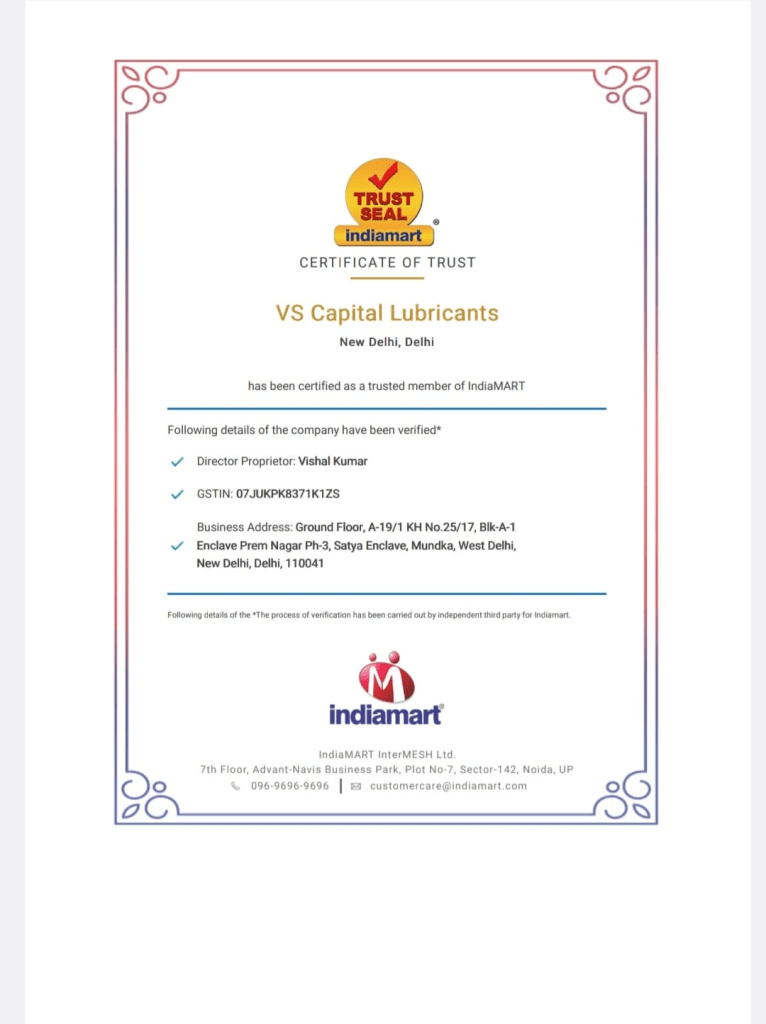 Bravo à VS Capital Lubricants qui a reçu le prestigieux certificat TrustSeal d’IndiaMART. Cela témoigne de son engagement inébranlable envers la qualité et la fiabilité.