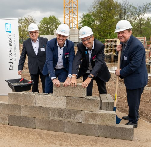 Sur la photo de la cérémonie, de gauche à droite Michel Sordi – Maire de Cernay, Christophe Stoos – Directeur Général Endress+Hauser Flow France, Claunel Massiès – Directeur Général Endress+Hauser France et Gilbert Stimpflin – Président de la CCIAE délégation Mulhouse Sud Alsace, posent la première pierre du bâtiment Nexus.