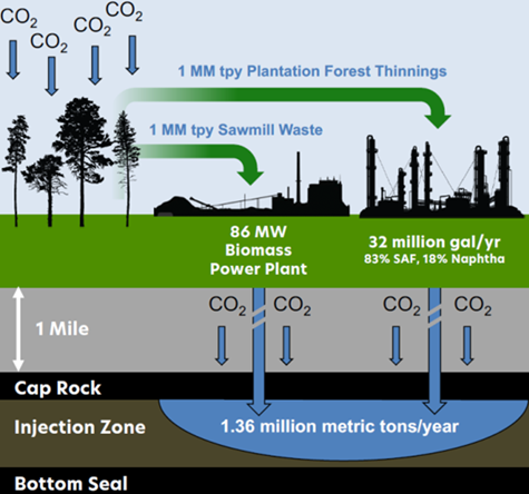 Le projet devrait développer une installation de production capable de générer 32 millions de gallons de SAF par an, avec du naphta renouvelable comme sous-produit, d’ici 2029. Il intègre un processus unique qui convertit les déchets de biomasse en gaz de synthèse, ensuite synthétisés en SAF et en naphta renouvelable. De plus, une centrale électrique alimentée à la biomasse sur site, équipée d’une installation de captage et de stockage du CO2, réduira les émissions du projet, conduisant à une empreinte carbone « profondément négative », équivalente au retrait de près de 300 000 voitures particulières de la route chaque année.