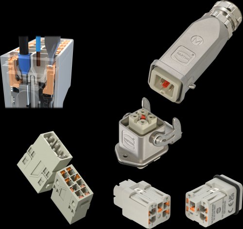 Le Han® Push-In est disponible pour la gamme des connecteurs modulaires de HARTING. Compact, elle est une technologie de raccordement intéressante pour sa densité de câblage : les modules Han® DD Push-In proposent 12 contacts pour un seul emplacement modulaire. En utilisant les modules Han® C ou Han® CC Push-In, il est aussi possible de connecter de la puissance avec des fils jusqu’à 6 mm². Le connecteur compact Han® 3A est également disponible avec 3 ou 4 contacts avec Terre. Le connecteur devient alors un connecteur de terrain facile à assembler pour alimenter des équipements monophasés ou triphasés.