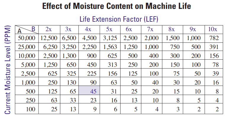 Dans le graphique ci-dessous, une huile contenant 500 ppm d’eau qui a perdu de l’eau jusqu’à 45 ppm augmentera la durée de vie de la machine de 400 %.