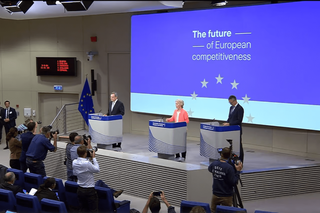 Mario Draghi a remis son rapport sur la compétitivité de l’industrie européenne à Ursula von der Leyen, présidente de la Commission européenne. ©Commission européenne. (Photo via journalauto 10/10/2024)