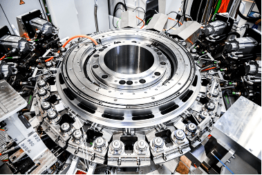 Machine à transfert rotatif hautement dynamique RT e-cam de Strama-MPS pour l’usinage de métaux. La table tournante est entraînée par un moteur couple de la série RIB, le positionnement rigide et précis est assuré par un roulement à rouleaux axial-radial YRTC, tous deux de Schaeffler.