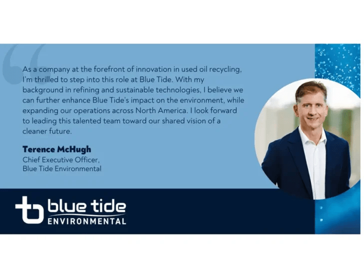 David Cecere, associé chez Tailwater Capital et membre du conseil d’administration de Blue Tide, a souligné la vaste expérience de M. McHugh. « L’expertise approfondie de Terry dans le domaine du raffinage, des carburants durables et du développement commercial, combinée à son leadership éprouvé dans les opérations mondiales, fait de lui un atout inestimable alors que Blue Tide poursuit sa mission de fournir des solutions de recyclage innovantes à l’industrie des lubrifiants. »