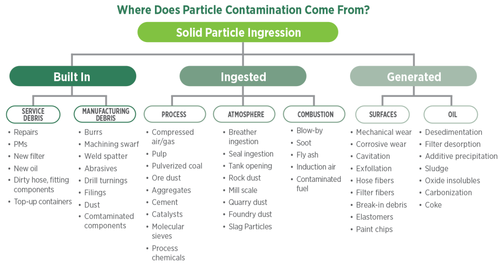 Les particules peuvent être ingérées à partir du processus, de l’atmosphère ou de la combustion par le biais de joints, de tuyaux et de flexibles qui fuient. Cependant, la méthode d’entrée la plus courante est par l’espace de tête. Les trappes ou les orifices ouverts sur le dessus d’un réservoir doivent être fermés pour empêcher l’entrée de particules.