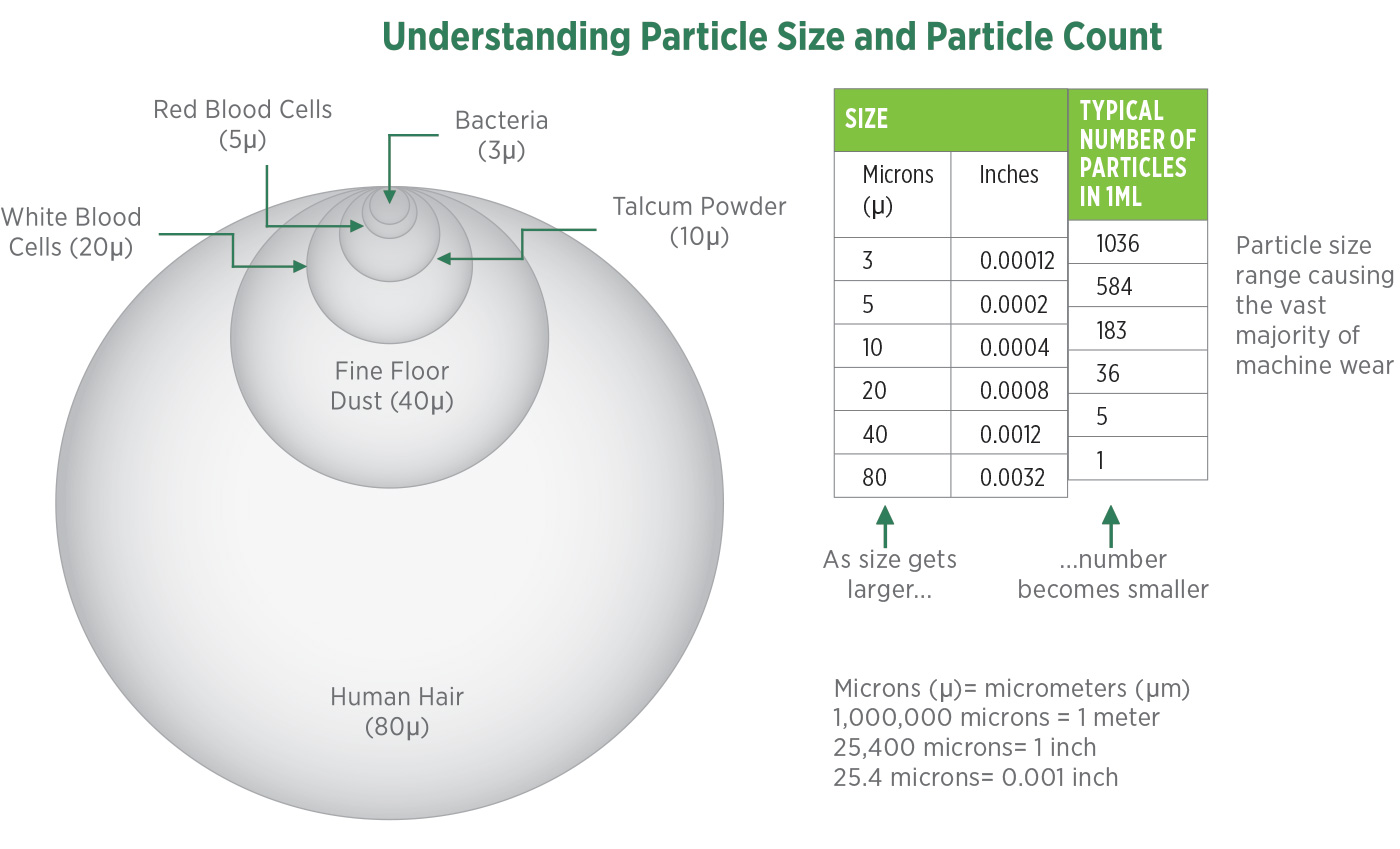 Sans loupe ni microscope, l’œil humain ne peut voir que des particules d’une taille d’environ 40 microns. Les particules qui endommagent le plus nos lubrifiants sont de l’ordre de 3 à 10 microns, ce qui est beaucoup plus petit que ce que l’on peut voir lors d’une inspection visuelle classique du lubrifiant .