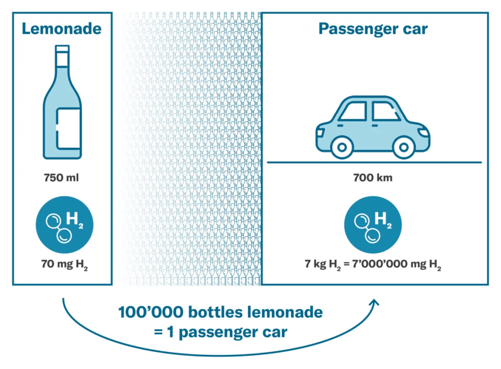 Une voiture légère a besoin d’environ 7 kg d’hydrogène pour parcourir une distance de 700 kilomètres. Une bouteille de limonade d’une contenance de 750 ml, par exemple, peut contenir moins de 70 milligrammes d’hydrogène à pression atmosphérique.