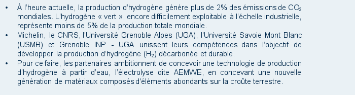 Michelin, le CNRS, l’Université Grenoble Alpes, Grenoble INP – UGA et l’Université Savoie Mont Blanc ont inauguré le 14 mars 2025 une nouvelle collaboration. Pour une durée de quatre ans, les équipes de recherche travailleront au développement d’une technologie de production d’hydrogène durable à partir d’eau. Ce laboratoire commun est le troisième LabCom unissant les compétences de Michelin et du CNRS dédié au déploiement de technologies de production d’hydrogène vert.