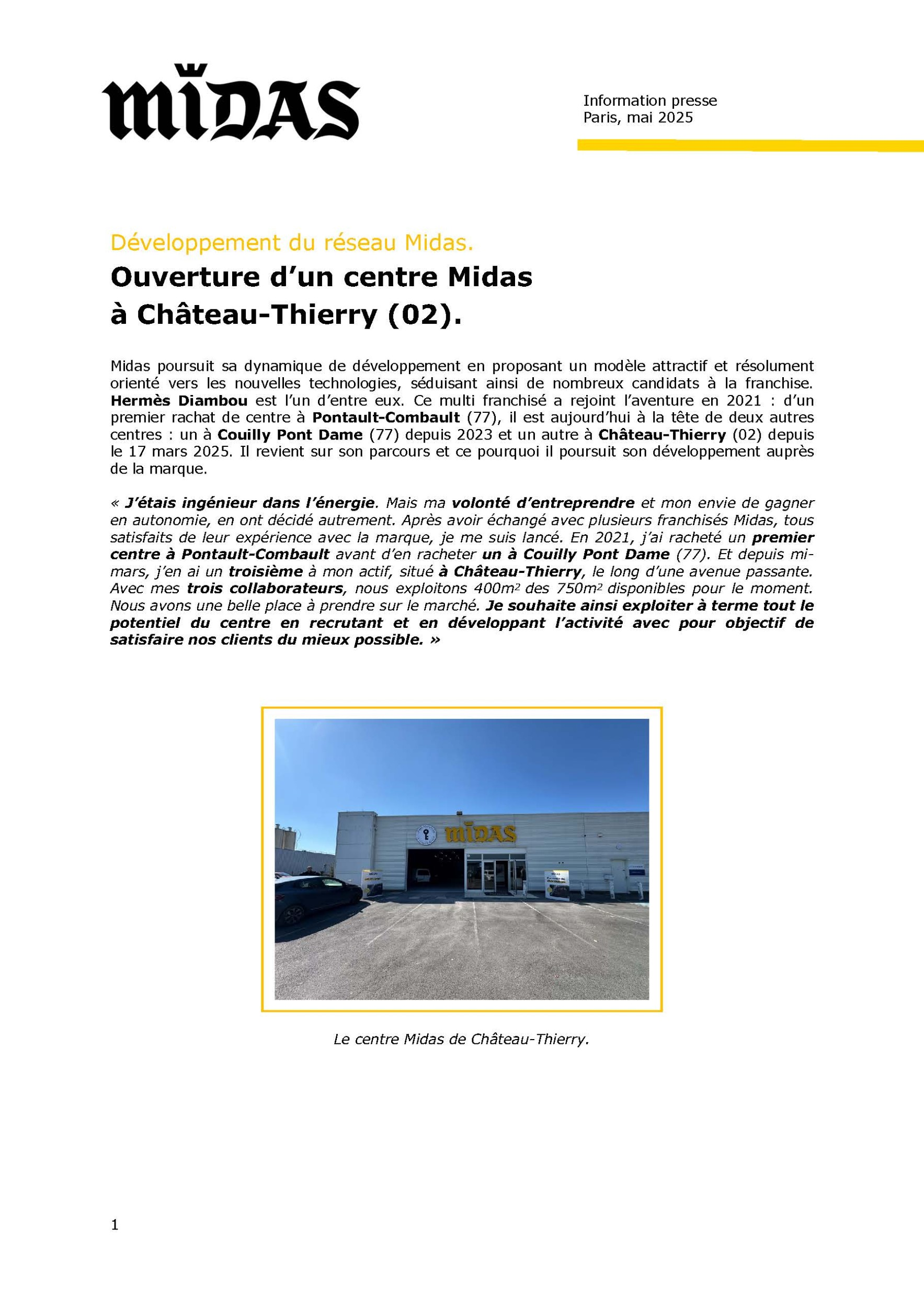 Développement en franchise – Midas ouvre un nouveau centre à Château-Thierry (02).