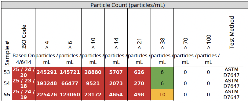 Cependant, l’échantillon aurait pu être prélevé après la source des particules et avant leur accumulation dans le filtre à fluide. Dans ce cas, les valeurs les plus faibles pourraient être plus importantes, car elles provoquent des piqûres ou une usure par glissement en d’autres points du système.