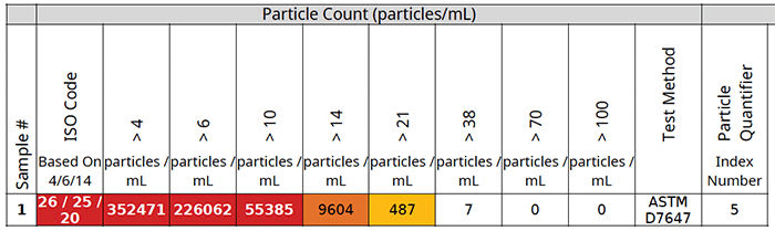 Le nombre de particules de chaque catégorie granulométrique permet de déterminer le niveau de contamination de l’huile. Les résultats sont exprimés en nombre de particules par millilitre, à plusieurs microns près, et sont rapportés selon la norme ISO 4406 (ou code ISO).