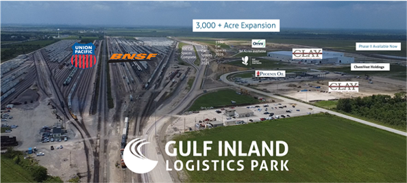 L’un des rares sites à double desserte ferroviaire de la région, le Gulf Inland Logistics Park offre un emplacement inégalé pour l’implantation et le développement des entreprises de logistique, de transport et de fabrication. Le Gulf Inland Logistics Park offre un accès immédiat aux deux plus grands chemins de fer américains de classe I, le BNSF Railway et l’Union Pacific Railroad. Le CMC Railroad a une capacité prévue de plus de 2 000 wagons, qui seront tous ouverts d’ici 2026.