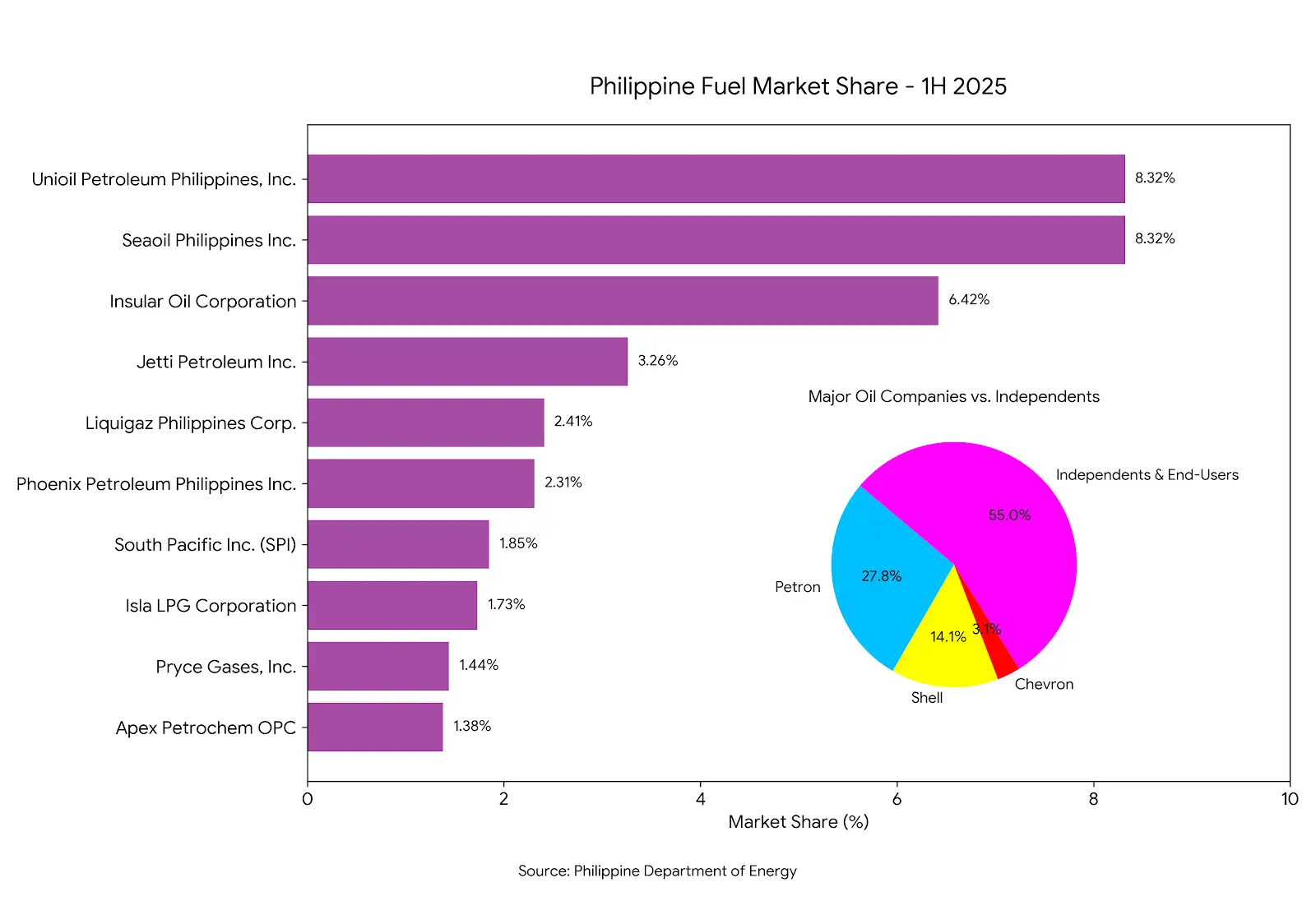 De récentes données publiées par le ministère de l’Énergie (DOE) indiquent que les opérateurs indépendants et les importateurs directs détiennent désormais 55 % du marché philippin des carburants. Cette progression marque un tournant historique : pour la première fois depuis la déréglementation du secteur en 1998, la part de marché combinée des trois acteurs traditionnels – Petron Corp., Shell Pilipinas Corp. et Chevron Philippines – passe en position minoritaire.