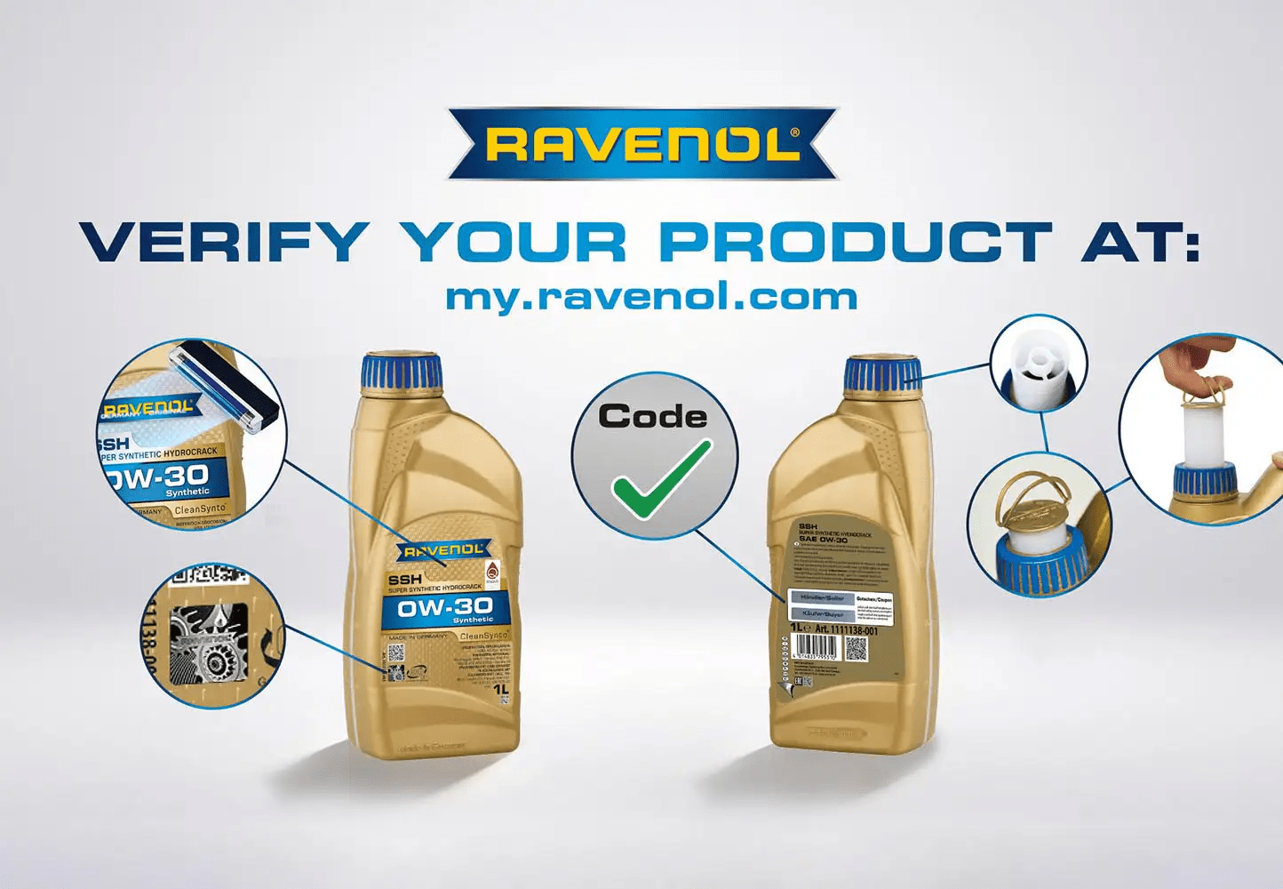 Le système Ravenol utilise des éléments de sécurité physiques tels que des scellés d’authenticité, des hologrammes et des marquages ultraviolets visibles uniquement sous lumière noire. Les bidons de 1,4 et 5 litres sont équipés de bec extractible intégré, tandis que les packs de 4 et 5 litres présentent des poignées ergonomiques et un goulot texturé.